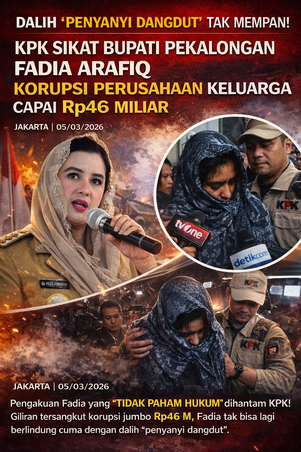JAKARTA – Panggung politik Kabupaten Pekalongan kini berganti menjadi panggung hukum yang kelam. Komisi Pemberantasan Korupsi (KPK) secara resmi menetapkan Bupati Pekalongan, Fadia Arafiq (FAR), sebagai tersangka korupsi menyusul Operasi Tangkap Tangan (OTT) pada 2-3 Maret 2026. Alibi Fadia yang mengaku “tidak paham hukum” karena berlatar belakang musisi dangdut, langsung dihantam keras oleh penyidik, Kamis (05/03/2026).