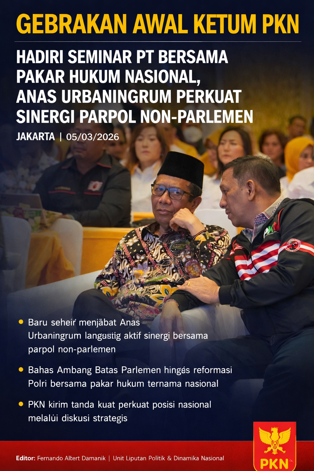 JAKARTA – Satu hari pasca didapuk menjadi Nakhoda baru Partai Kebangkitan Nusantara (PKN), Anas Urbaningrum langsung tancap gas memperkuat posisi politik partai di tingkat nasional. Dalam kesibukan perdananya, Ketum PKN ini menghadiri seminar krusial terkait Parliamentary Threshold (Ambang Batas Parlemen) yang menghadirkan deretan begawan hukum dan tokoh nasional, Kamis (05/03/2026).