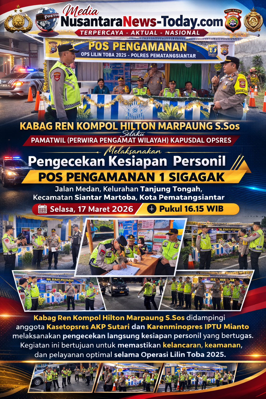 Media NusantaraNews-Today.com.Kota Pematangsiantar -Kabag Ren Kompol Hilton Marpaung S.Sos selaku Pamatwil (Perwira Pengamat Wilayah) Kapusdal Opsres bersama anggota Kasetopsres AKP Sutari dan Karenminopres IPTU Mianto melaksanakan pengecekan Kesiapan Personil di Pos Pengamanan 1 Sigagak, Jalan Medan Kelurahan Tanjung Tongah, Kecamatan Siantar Martoba, Kota Pematangsiantar, pada Selasa 17 Maret 2026 sore pukul 16.15 WIB.