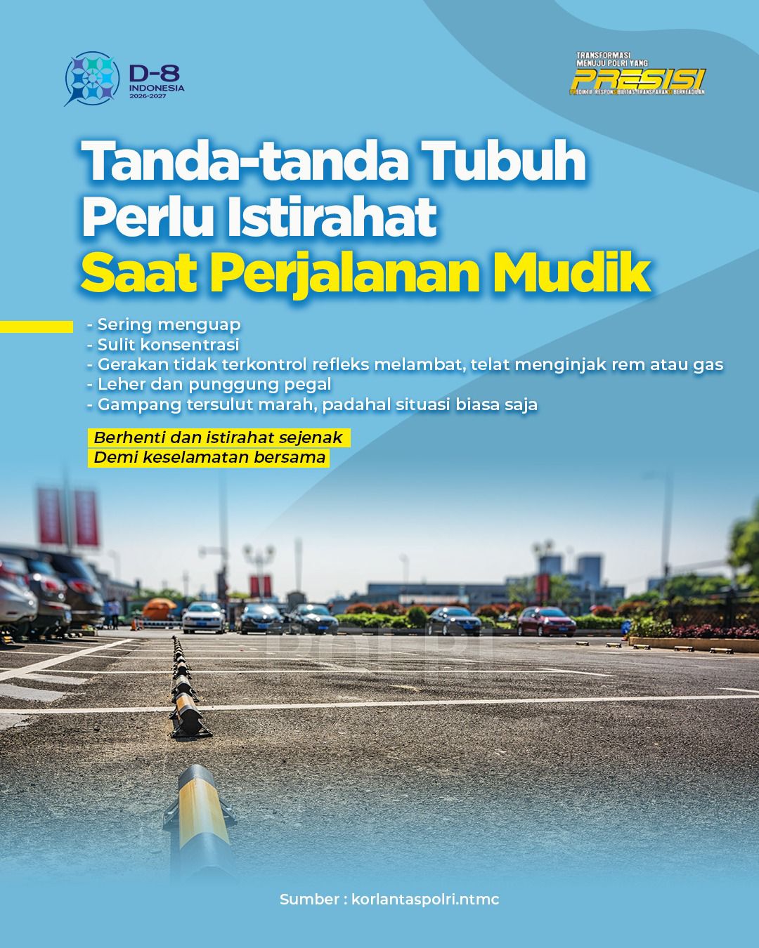 Polri mengimbau para pemudik untuk segera menepi dan beristirahat apabila mulai merasakan tanda-tanda kelelahan saat berkendara. Beberapa gejala yang perlu diwaspadai antara lain sering menguap, sulit fokus, refleks melambat, hingga emosi yang mudah terpancing.