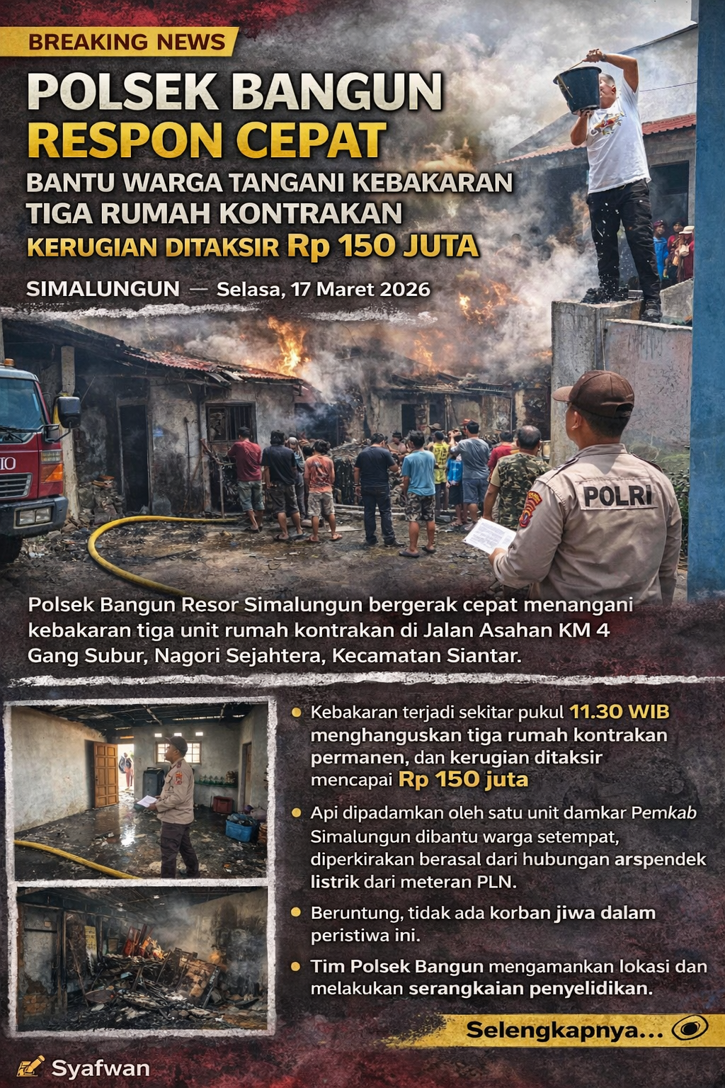 SIMALUNGUN – Polsek Bangun Resor Simalungun menunjukkan respons cepat dalam penanganan kebakaran tiga unit rumah kontrakan permanen di Jalan Asahan KM 4 Gang Subur, Nagori Sejahtera, Kecamatan Siantar, Kabupaten Simalungun, Selasa (17/3/2026). Kebakaran yang terjadi sekitar pukul 11.30 WIB ini menimbulkan kerugian material ditaksir mencapai Rp 150 juta, namun tidak ada korban jiwa.