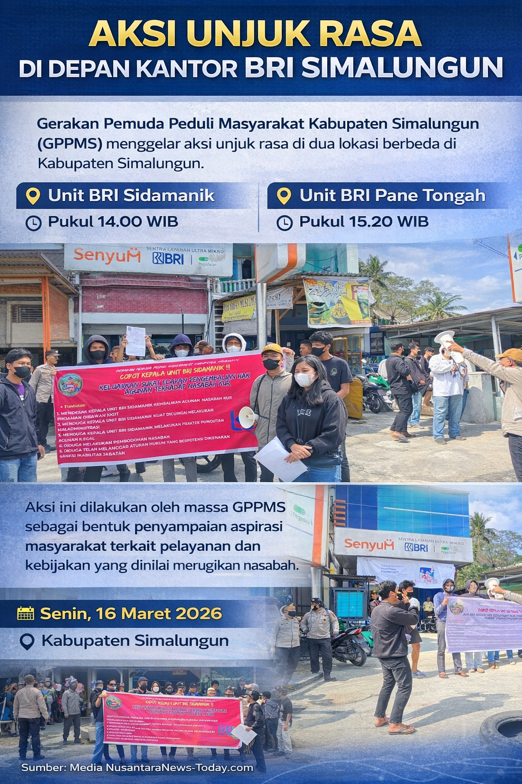 Media NusantaraNews-Today.com.Kabupaten Simalungun-| Aksi unjuk rasa dilakukan Gerakan Pemuda Peduli Masyarakat Kabupaten Simalungun (GPPMS) di depan Kantor Unit Bank Rakyat Indonesia (BRI) Sidamanik pada Pukul 14.00 WIB dan di depan Unit BRI Pane Tongah Kabupaten Simalungun pukul 15.20 WIB, pada Senin (16/3/2026).