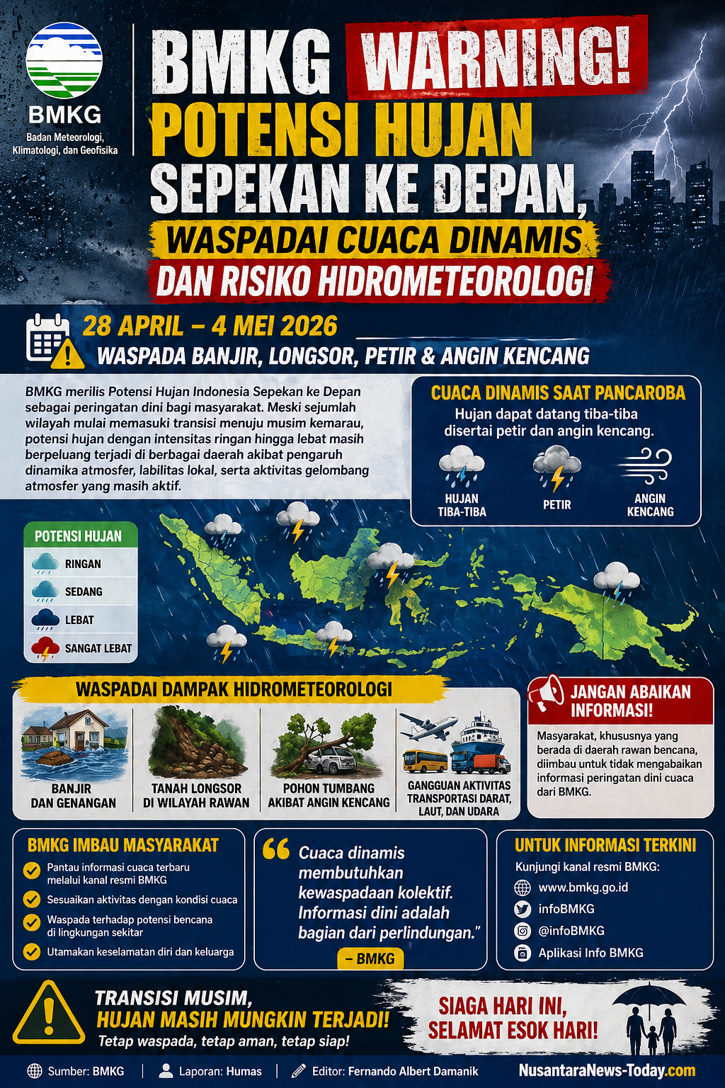 JAKARTA – Badan Meteorologi, Klimatologi, dan Geofisika (BMKG) kembali merilis Potensi Hujan Indonesia Sepekan ke Depan untuk periode 28 April hingga 4 Mei 2026, sebagai peringatan dini bagi masyarakat agar meningkatkan kewaspadaan terhadap dinamika cuaca di masa peralihan musim.