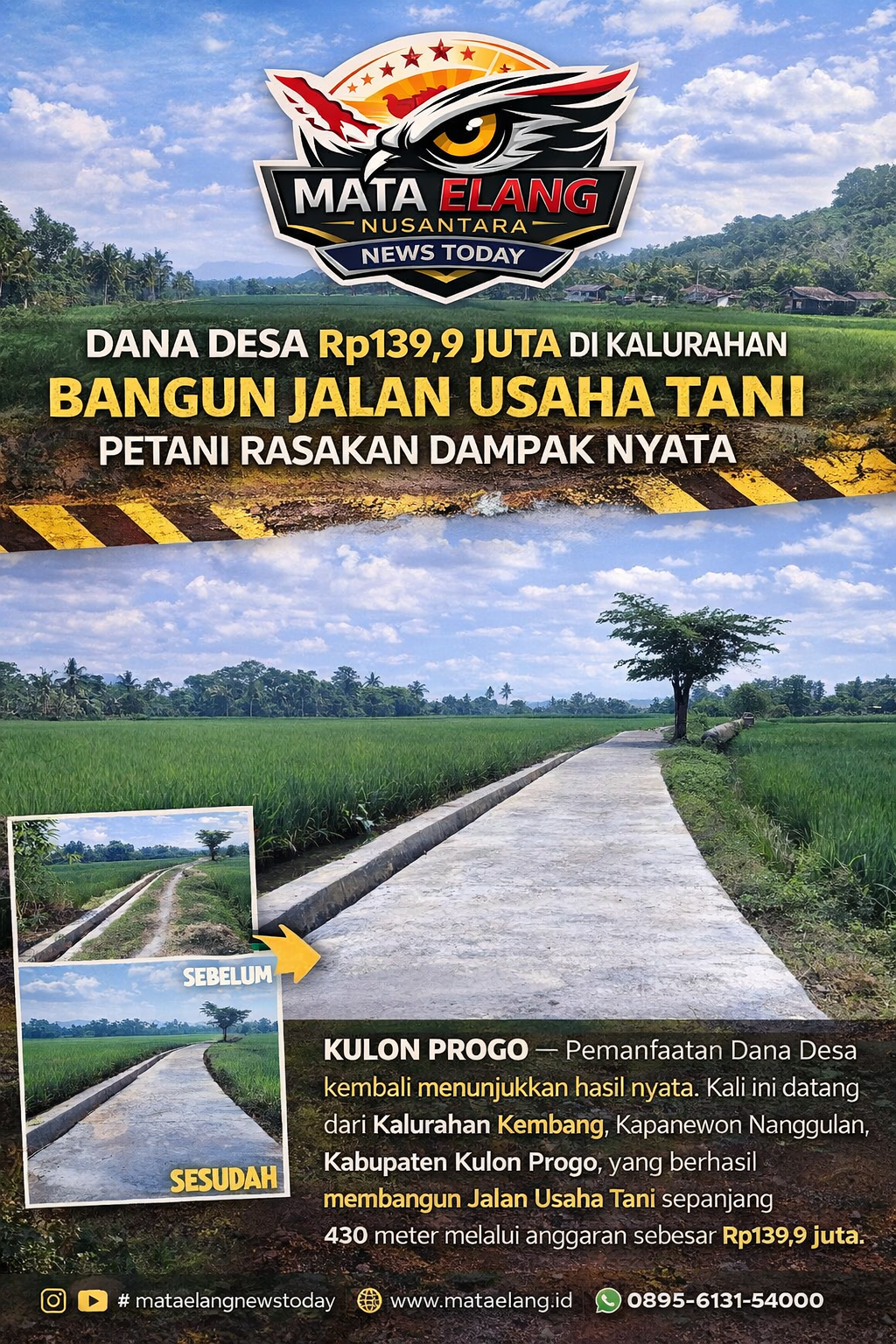 KULON PROGO – Pemanfaatan Dana Desa kembali menunjukkan hasil nyata. Kali ini datang dari Kalurahan Kembang, Kapanewon Nanggulan, Kabupaten Kulon Progo, yang berhasil membangun Jalan Usaha Tani sepanjang 430 meter melalui anggaran sebesar Rp139,9 juta.