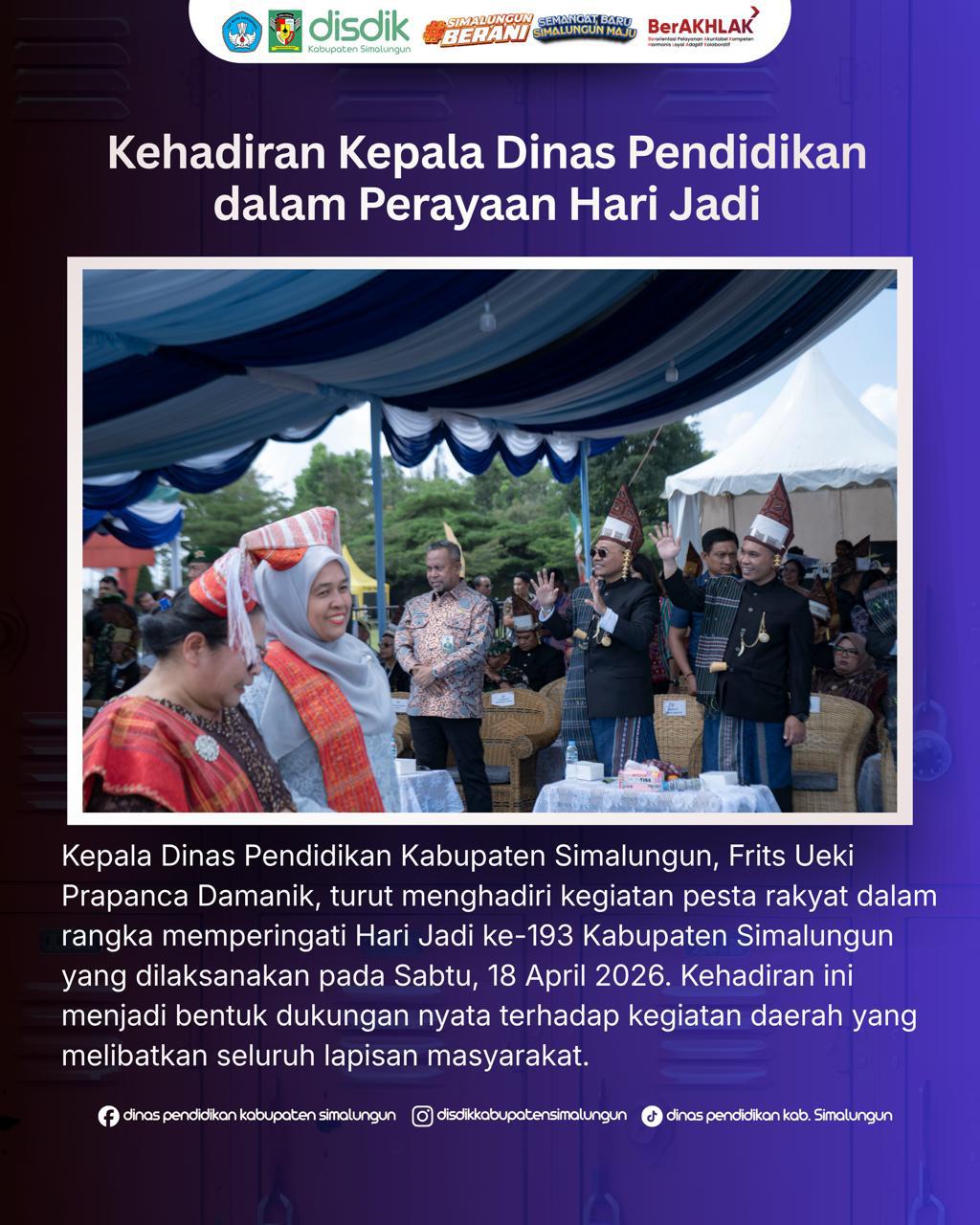 SIMALUNGUN – Dinas Pendidikan Kabupaten Simalungun turut ambil bagian dalam rangkaian Hari Jadi Kabupaten Simalungun ke-193 melalui kehadiran dalam pesta rakyat yang digelar Sabtu (18/4/2026), sebagai bentuk dukungan terhadap pelestarian budaya, penguatan kebersamaan, dan semangat kolaborasi pembangunan daerah.