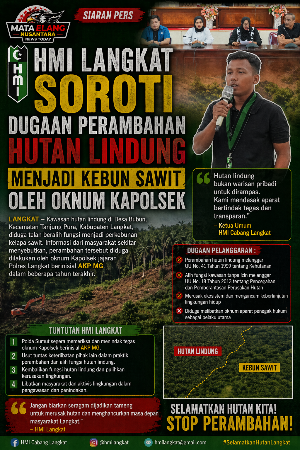 Selain itu, Sekretaris Umum HMI Cabang Langkat, M. Hafiz, menegaskan bahwa perambahan kawasan hutan lindung merupakan pelanggaran serius yang berdampak luas terhadap lingkungan dan masyarakat. Ia mendesak aktivitas tersebut segera dihentikan agar tidak ada lagi perambahan-perambahan hutan lindung lainnya.
