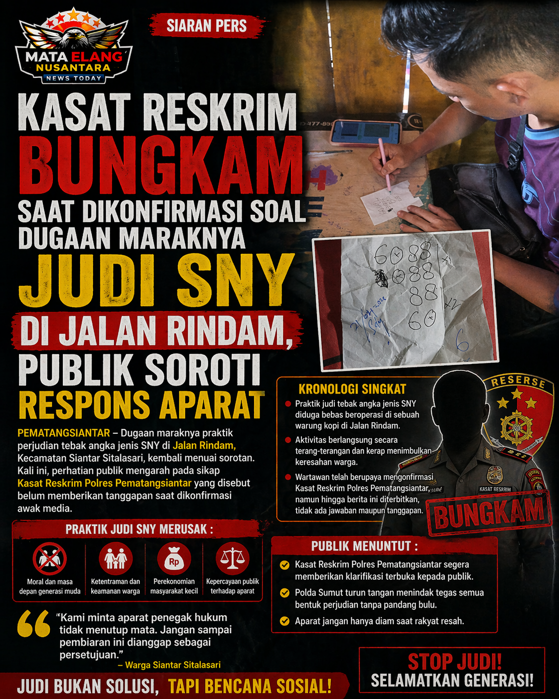 PEMATANGSIANTAR – Dugaan maraknya praktik perjudian tebak angka jenis SNY di Jalan Rindam, Kecamatan Siantar Sitalasari, kembali menuai sorotan. Kali ini, perhatian publik mengarah pada sikap Kasat Reskrim Polres Pematangsiantar yang disebut belum memberikan tanggapan saat dikonfirmasi awak media.
