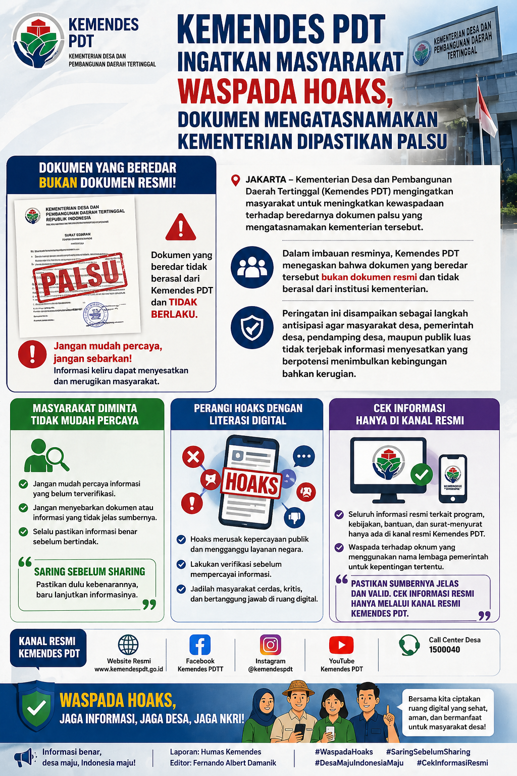 “Pastikan sumbernya jelas dan valid. Cek informasi resmi hanya melalui kanal resmi Kemendes PDT,” demikian pesan edukatif kementerian.