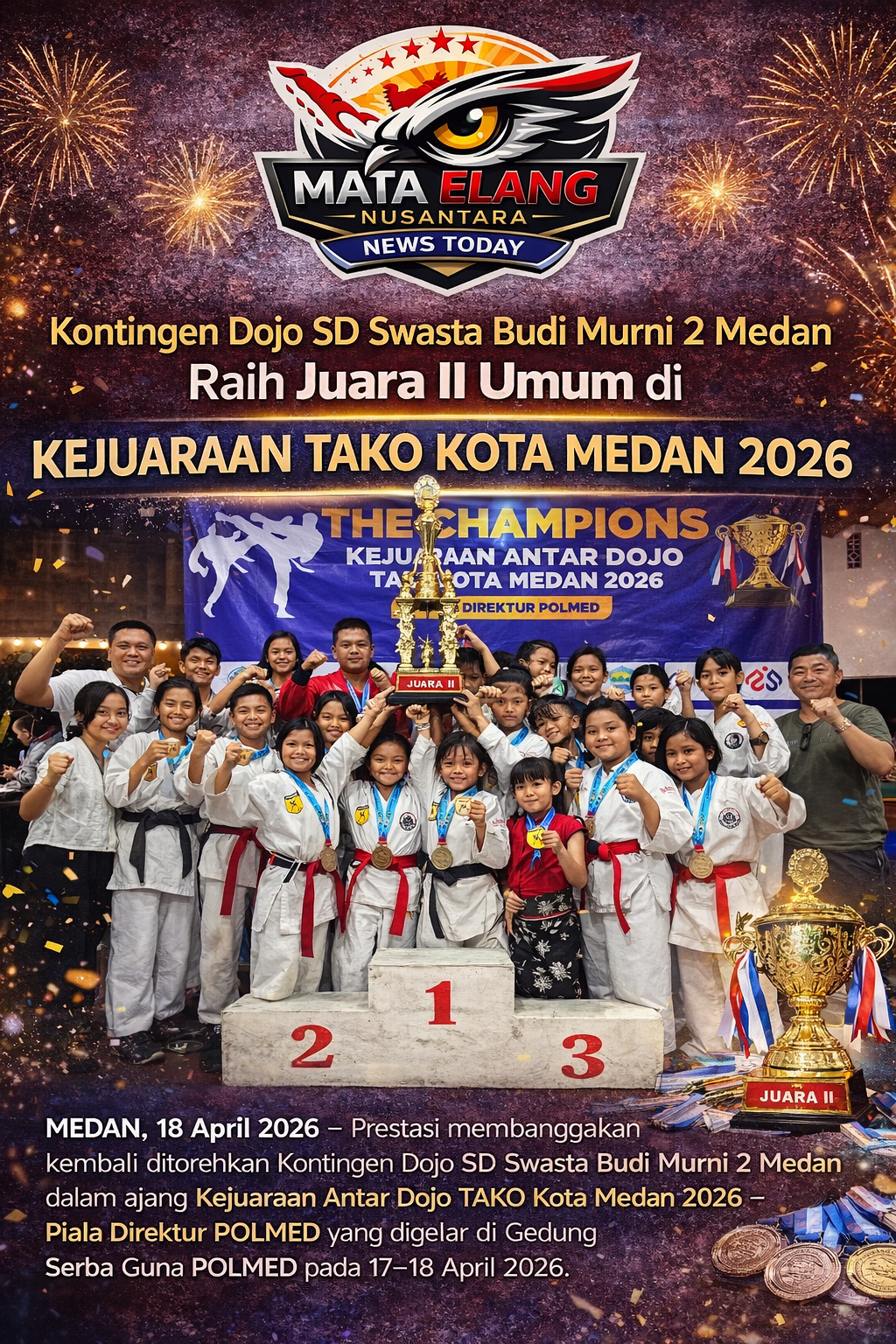 MEDAN, 18 April 2026 – Prestasi membanggakan kembali ditorehkan Kontingen Dojo SD Swasta Budi Murni 2 Medan dalam ajang Kejuaraan Antar Dojo TAKO Kota Medan 2026 – Piala Direktur POLMED yang digelar di Gedung Serba Guna POLMED pada 17–18 April 2026.