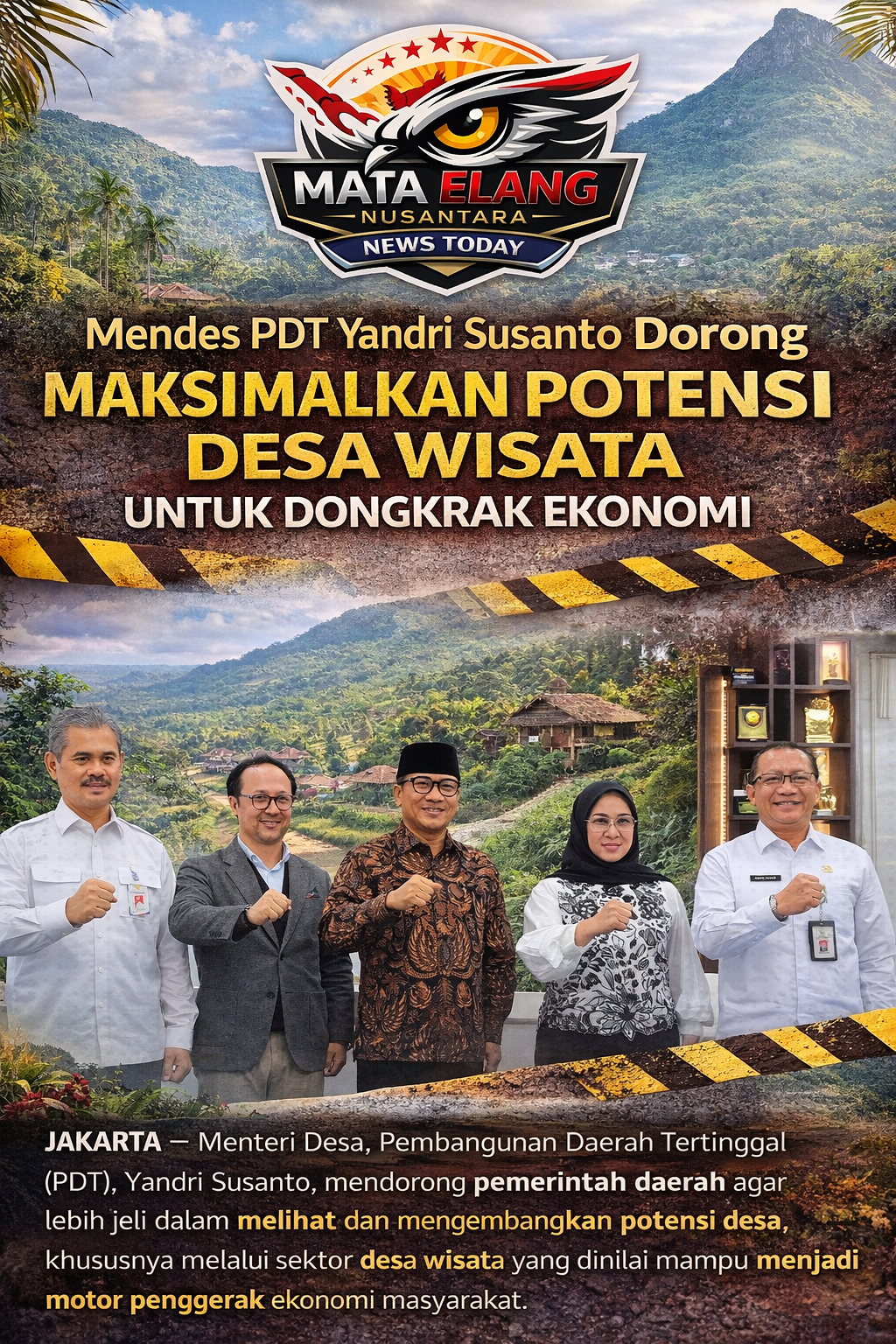 JAKARTA – Menteri Desa, Pembangunan Daerah Tertinggal (PDT), Yandri Susanto, mendorong pemerintah daerah agar lebih jeli dalam melihat dan mengembangkan potensi desa, khususnya melalui sektor desa wisata yang dinilai mampu menjadi motor penggerak ekonomi masyarakat.