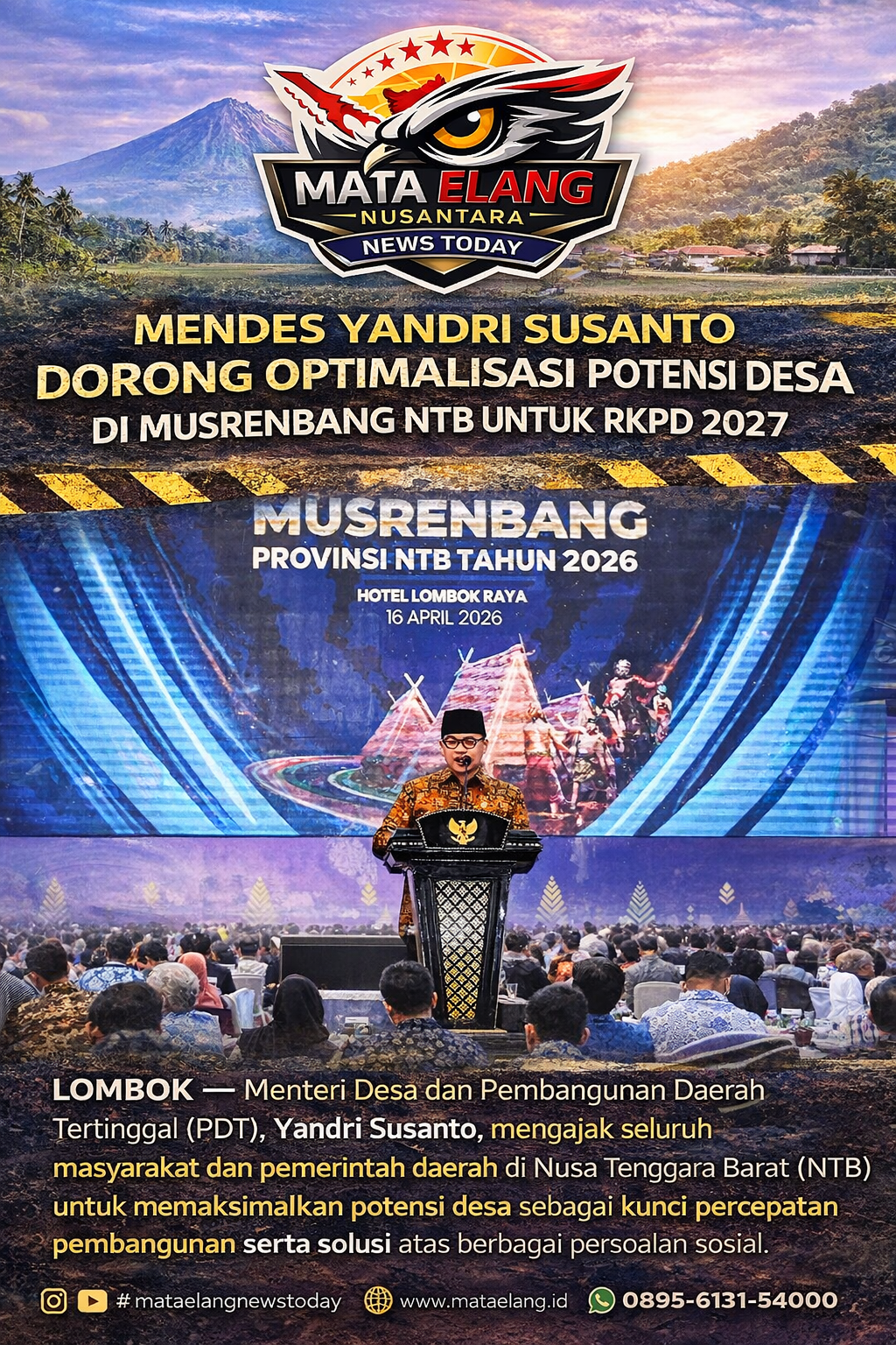 LOMBOK – Menteri Desa dan Pembangunan Daerah Tertinggal (PDT), Yandri Susanto, mengajak seluruh masyarakat dan pemerintah daerah di Nusa Tenggara Barat (NTB) untuk memaksimalkan potensi desa sebagai kunci percepatan pembangunan serta solusi atas berbagai persoalan sosial.