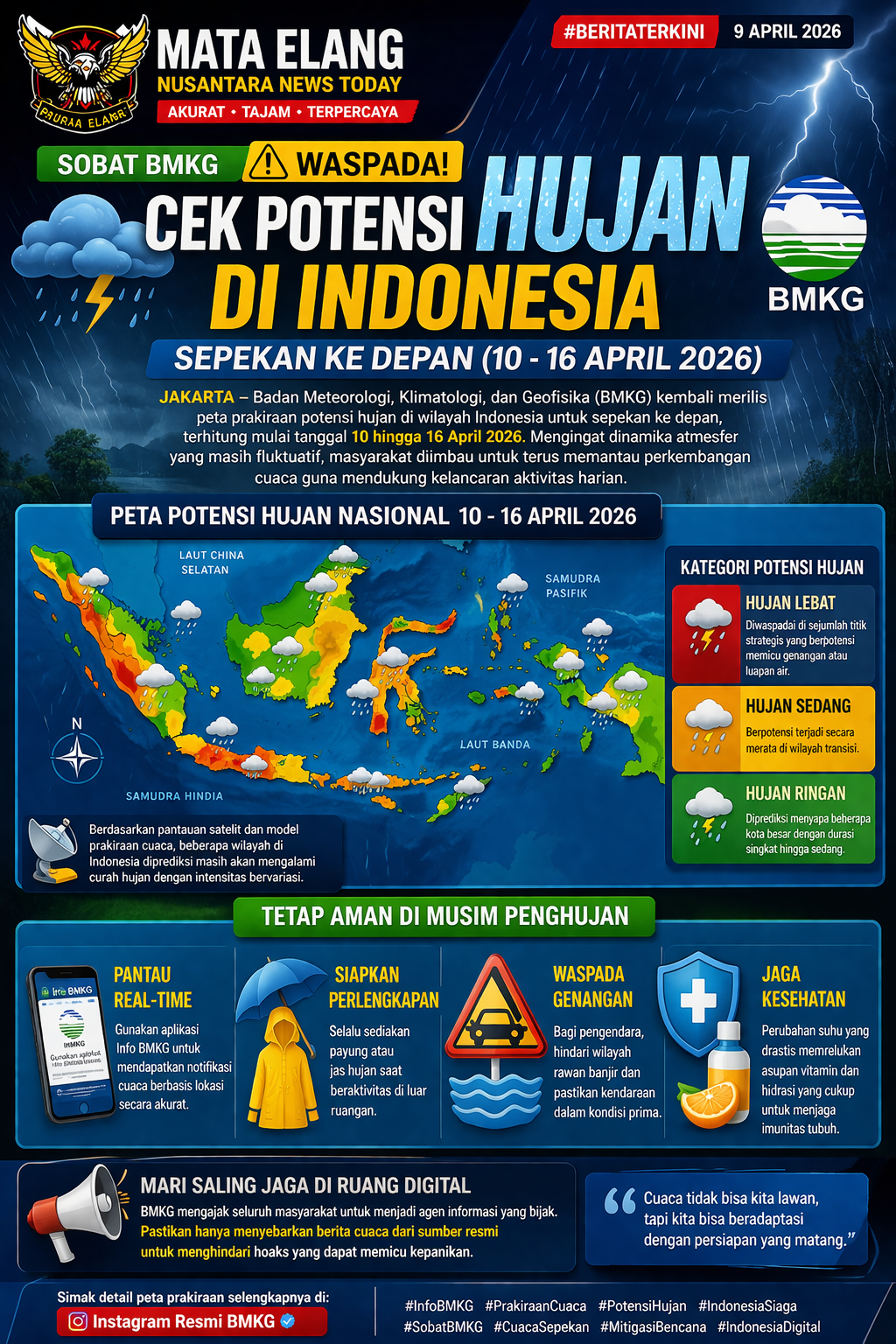 JAKARTA – Badan Meteorologi, Klimatologi, dan Geofisika (BMKG) kembali merilis peta prakiraan potensi hujan di wilayah Indonesia untuk sepekan ke depan, terhitung mulai tanggal 10 hingga 16 April 2026. Mengingat dinamika atmosfer yang masih fluktuatif, masyarakat diimbau untuk terus memantau perkembangan cuaca guna mendukung kelancaran aktivitas harian.