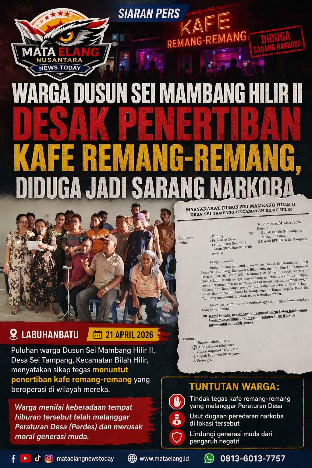 Puluhan warga Dusun Sei Mambang Hilir II, Desa Sei Tampang, Kecamatan Bilah Hilir, menyatakan sikap tegas menuntut penertiban kafe remang-remang yang beroperasi di wilayah mereka. Warga menilai keberadaan tempat hiburan tersebut telah melanggar Peraturan Desa (Perdes) dan merusak moral generasi muda.